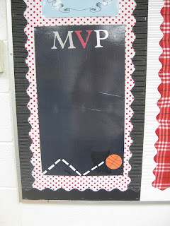 Since it is my first year teaching, I have been told by several to take pictures for memory purposes. So...here's our class. I went with a basketball theme...surprised? I also decided on red, black and white as the color scheme. I still have a bit to do but we're getting there:)